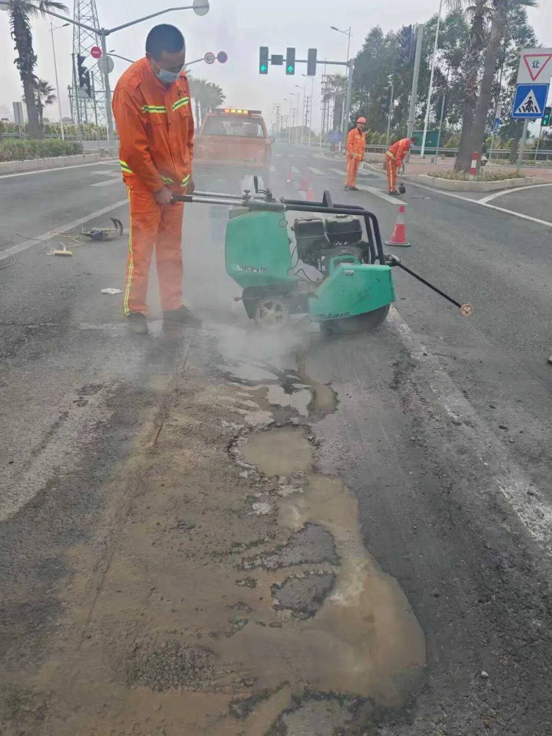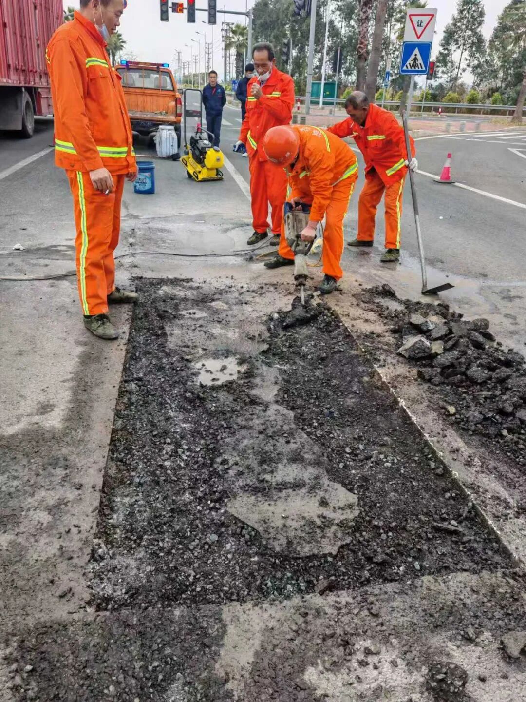 本次应用选取在省道红绿灯路口,由于处在车辆制动和起步位置,红绿灯路口是坑槽病害重灾区。相较于传统修补工艺和溶剂型材料修补工艺,该新型路面修复材料具有五大技术特点:一是施工便捷,人工设备投入少,即修复即通车;二是不惧潮湿环境,即使在雨天也可完成正常修补工作;三是性能优异,修复完成后快速成型,最终强度在标准试验条件下动稳定度达10000以上;四是绿色环保,产品采用环保材料,无溶剂,符合“绿色发展”的导向;五是产品适配性强,可直接采用回收沥青混合料进行修补,随拌随用,随取随用,性价比优异。